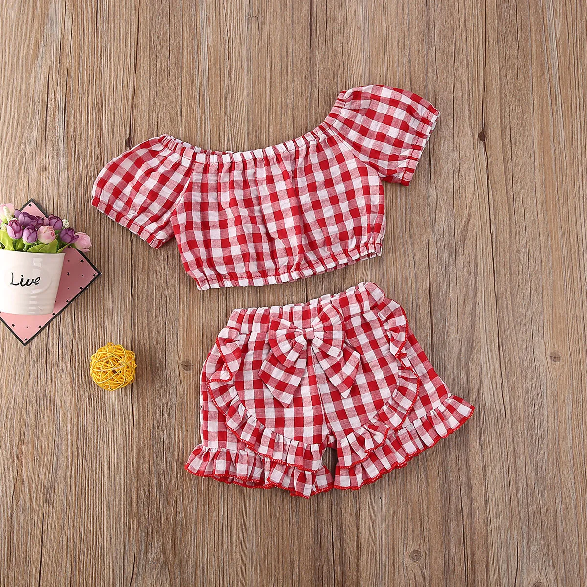 Special Offer 2個夏の幼児ガール服セットチェック柄オフショルダートップス弓ショーツパンツアウトフィット6m-4t Discount 10% Today!