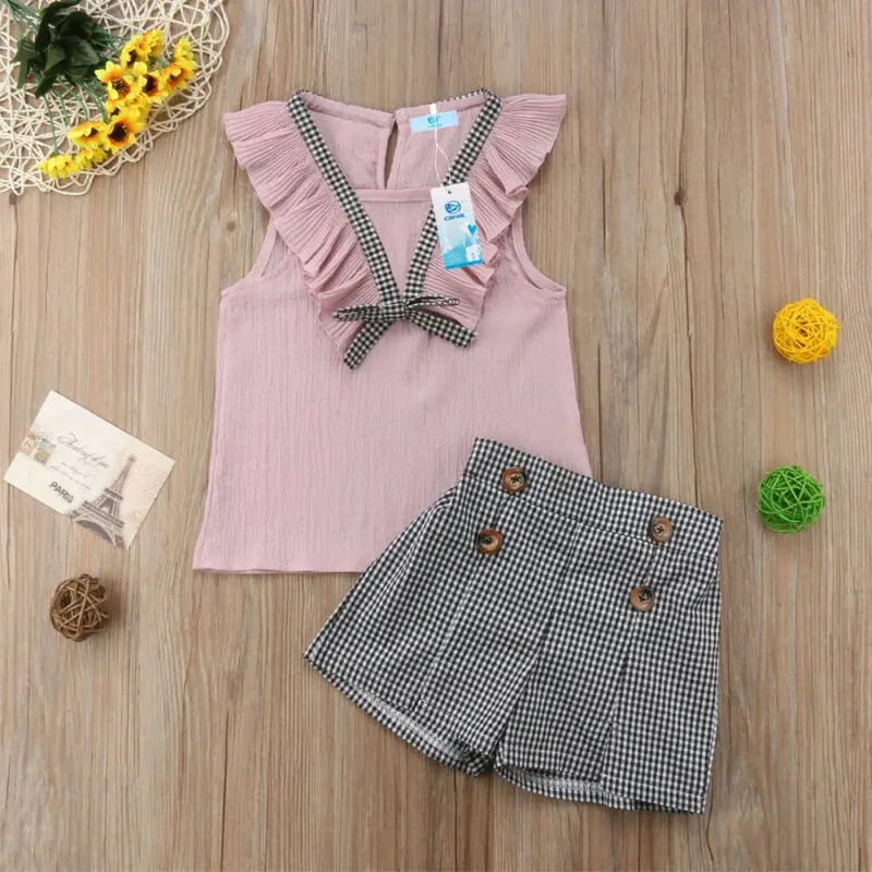 . (17% Off) 安い 2PCS Kids Baby Girls Outfits Summer Sleeveless Ruffled Chiffon T-shirt Tops+Grid Shorts Pant Clothes Set 通販 価格.