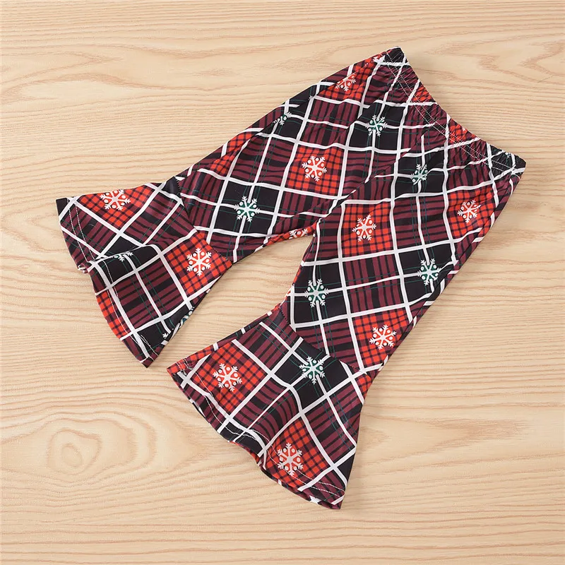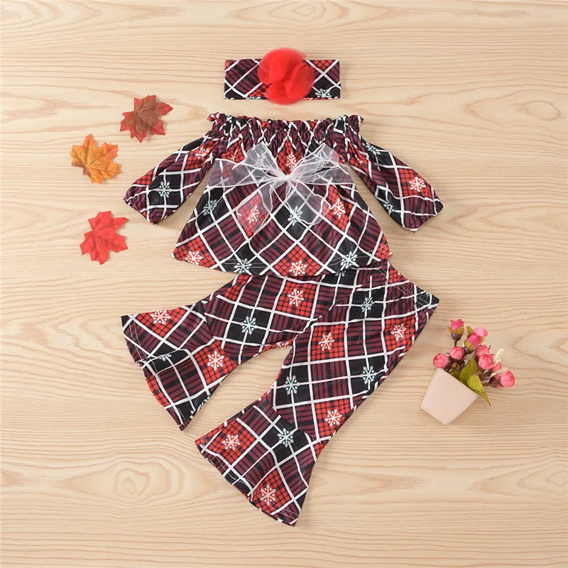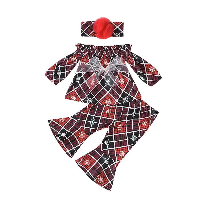 . (20% Off) 激安 ファッション 3 個幼児ガールクリスマス衣装セットスノーフレークオフプリントショルダー長袖チェック柄トップ + フレアパンツ + ヘッドバンドセット 通販 価格.