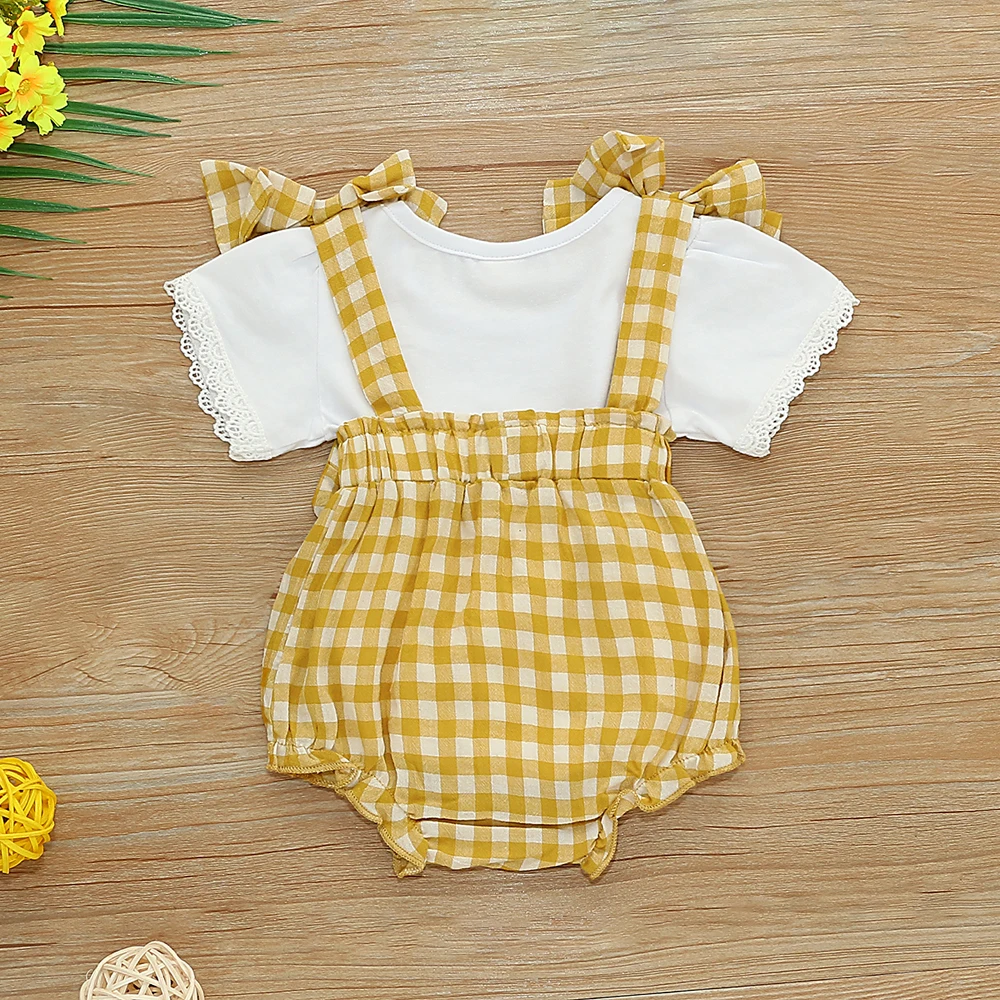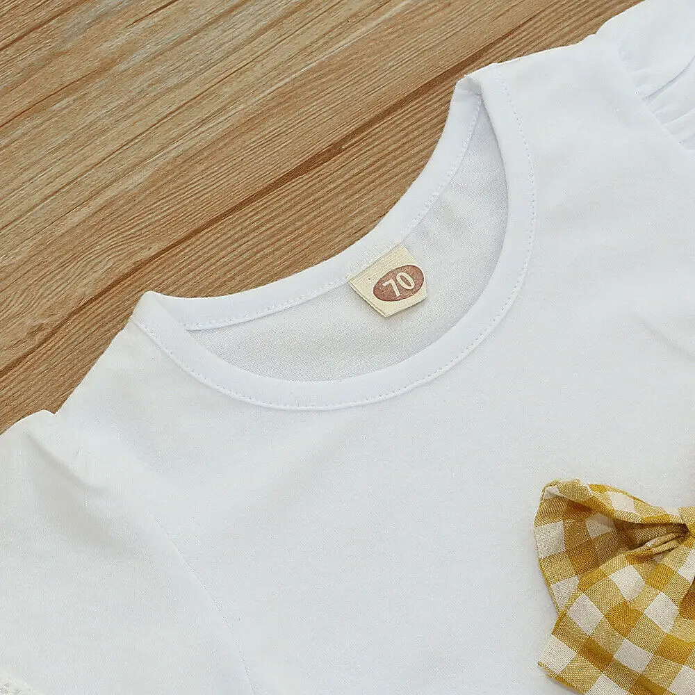 Special Offer 2019 最新のホット新生児幼児女の赤ちゃんレーススリーブ Tシャツトップス + 弓チェック柄全体よだれかけパンツ服セット Discount 32% Today!