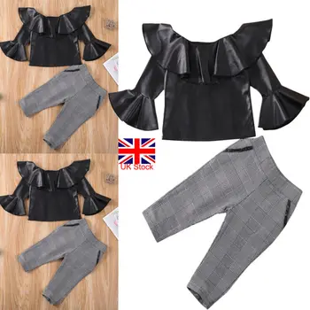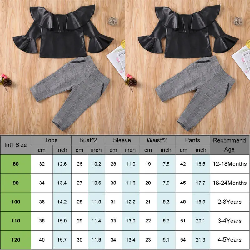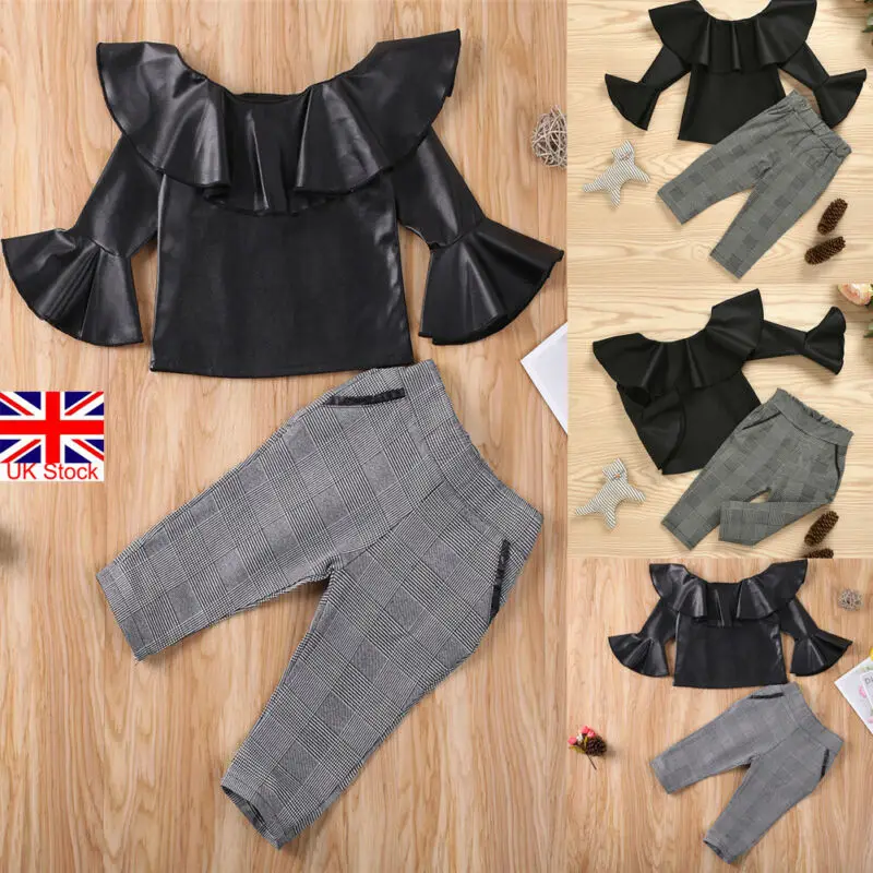 . (53% Off) 安い ファッションの幼児の女の子服セット子供ショルダーレザーフレアスリーブレストップ綿チェック柄パンツ衣装サイズ 1-5Y オンライン 価格.
