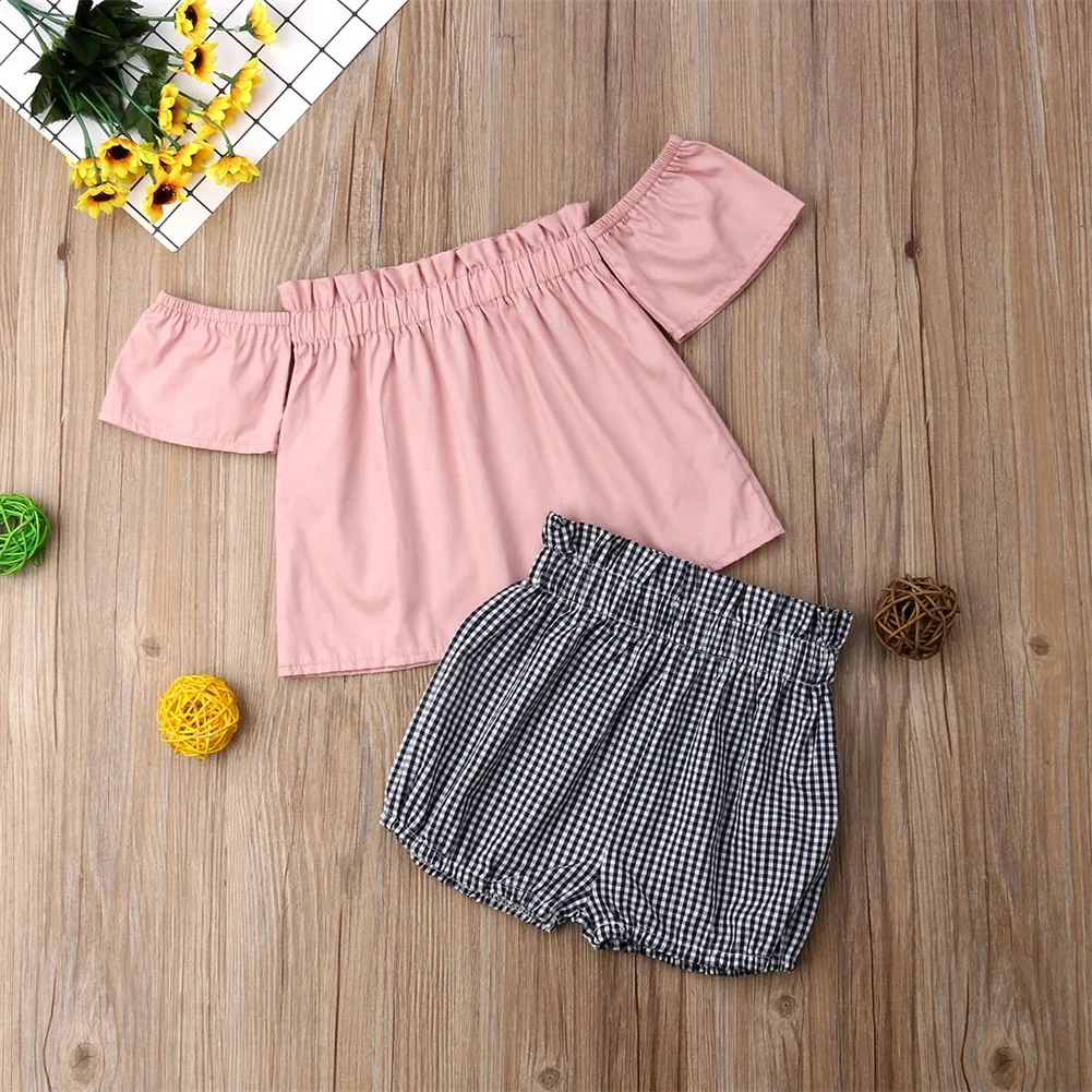 Special Offer 夏新ファッション 2 個新生児甘い女の子の因果綿ソリッドオフショルダーショートトップス + チェック柄パンツのパーティードレス服 Discount 0% Today!