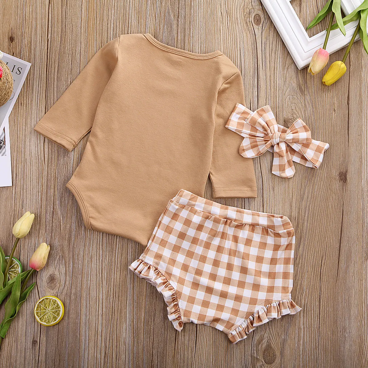 . (15% Off) 買取 Focusnorm 0-24M 3 個新生児幼児の少年少女の服カーキ長袖ジャンプスーツスーツチェック柄パンツカチューシャ 3 個セット オンライン 価格.