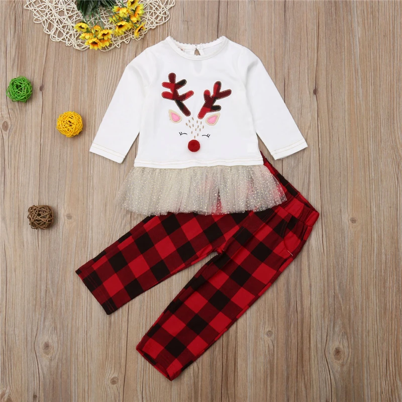 . (23% Off) 激安 子供クリスマス服プリントタッセルチュチュドレス長袖トップス + チェック柄パンツ2個クリスマス衣装セット オンライン 価格.