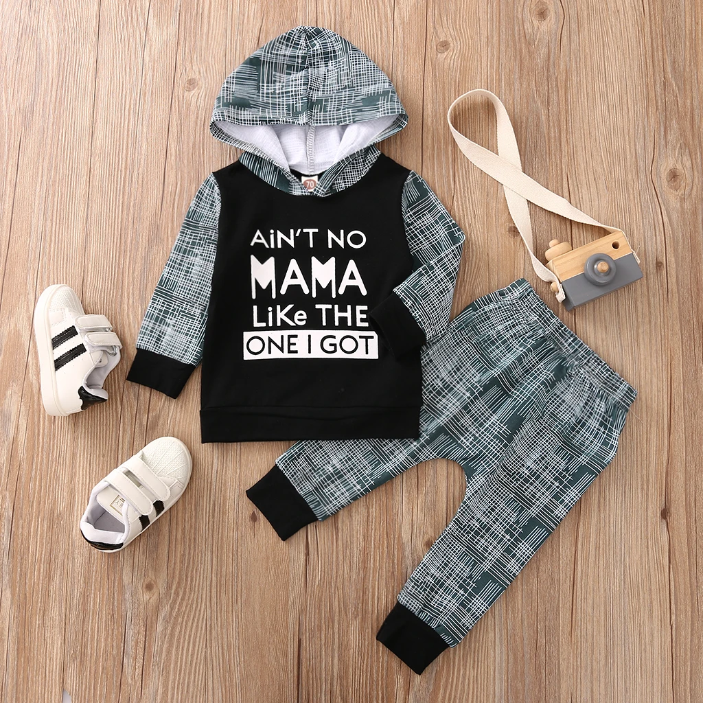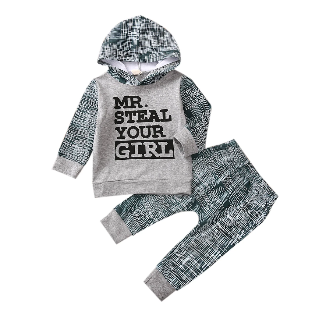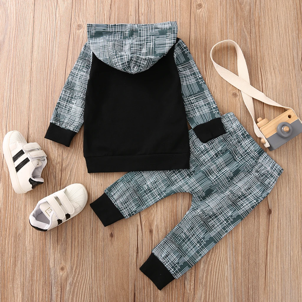 . (32% Off) 激安 幼児服服、ベビー少年少女フード付き長袖手紙印刷トップ + チェック柄ロングパンツ、黒/グレー オンライン 価格.