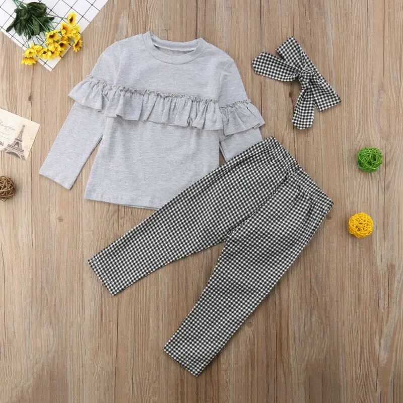 Special Offer 秋幼児子供セット長袖フリルトップス + チェック柄パンツレギンス Tousers + ヘッドバンド 3 個女の子衣装 1-6T Discount 19% Today!