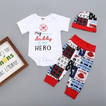 Product Name: 綿セット幼児ベビー Boys ファッション手紙印刷ボディスーツロンパース + チェック柄漫画パンツ + 帽子服新生児カジュアル素敵なセット