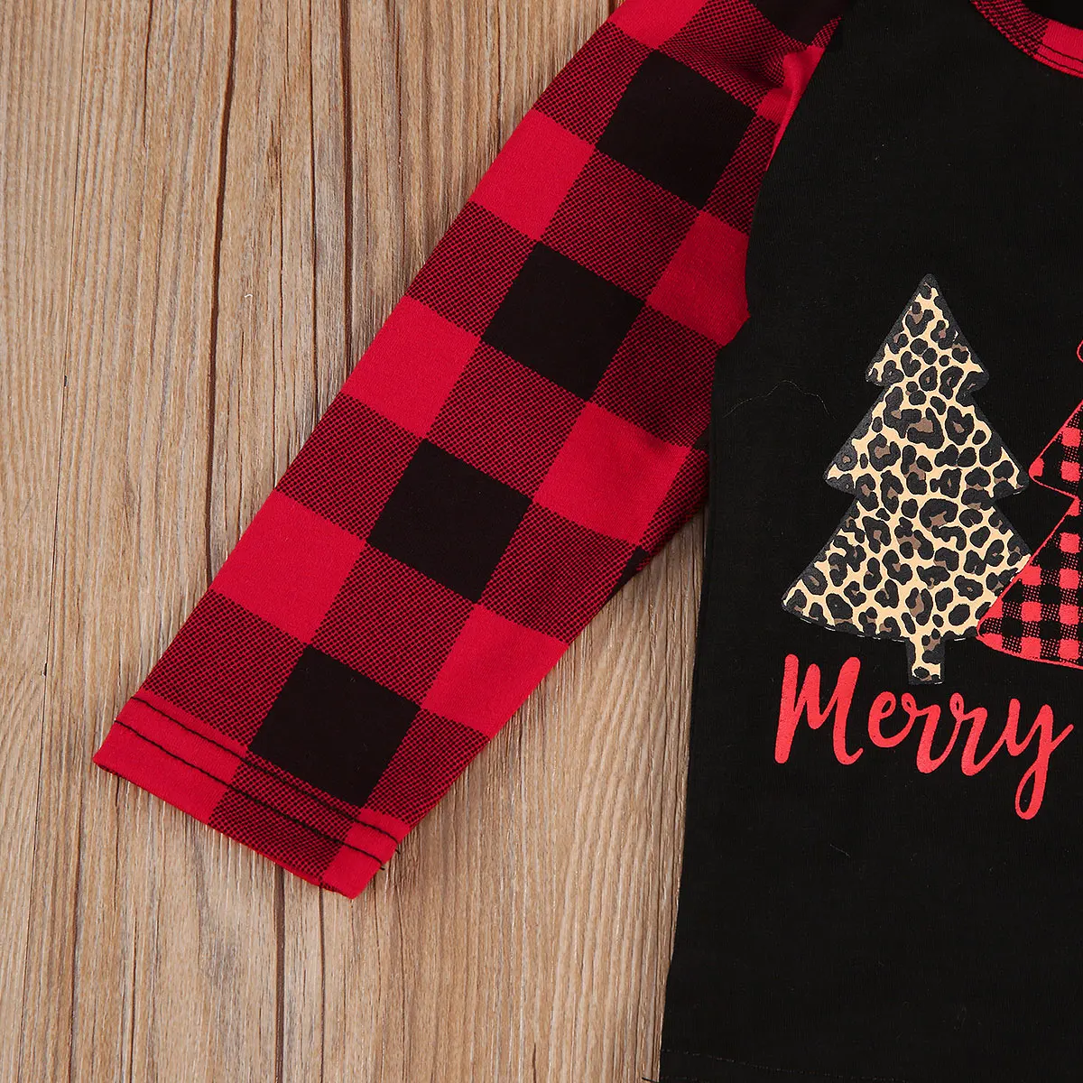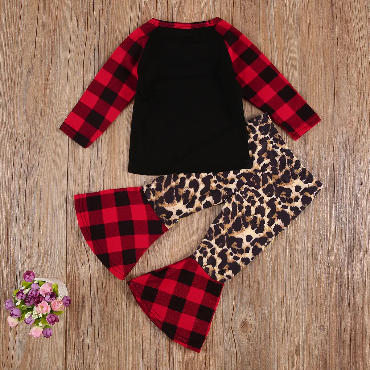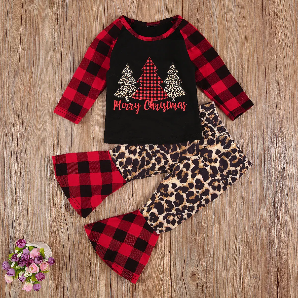 . (37% Off) 激安 クリスマスパーティー子供女の赤ちゃん服ヒョウ漫画プリント長袖トップス + チェック柄フレアパンツ2個幼児幼児スーツ オンライン 価格.