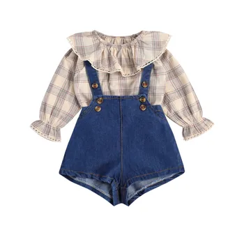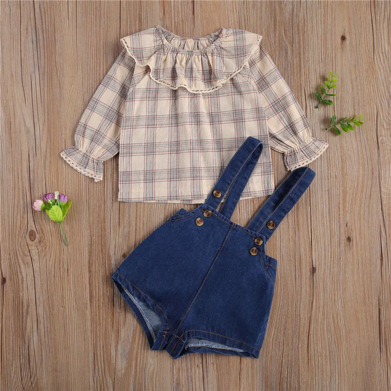 Special Offer 2個新生児カジュアル衣装女の子長袖フリル襟チェック柄プルオーバー + ショートサスペンダーパンツ Discount 48% Today!