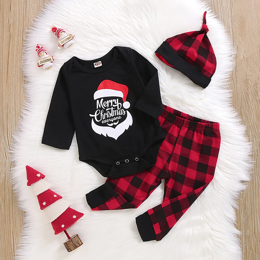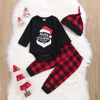 Product Name: 新生児少年少女服セットファッションかわいいプリント長袖クリスマスロンパースボディスーツ + チェック柄パンツセット детская одежда