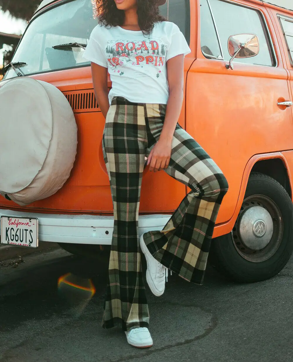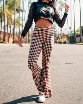 . (21% Off) 買取 S-XL 女性スリムチェック柄プリントストレッチフレアワイド脚パンツストリート着用英国スタイルベルボトムパンツズボン 通販 価格.