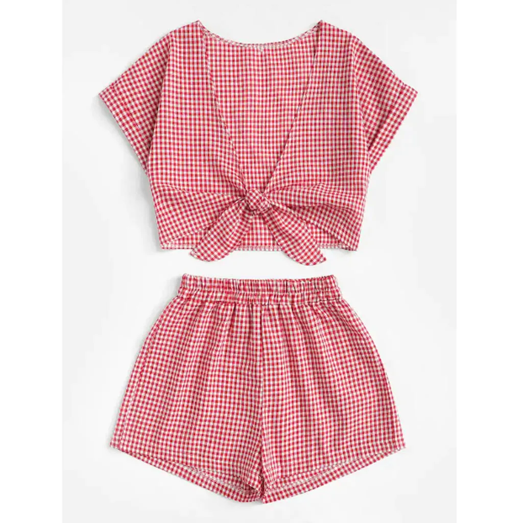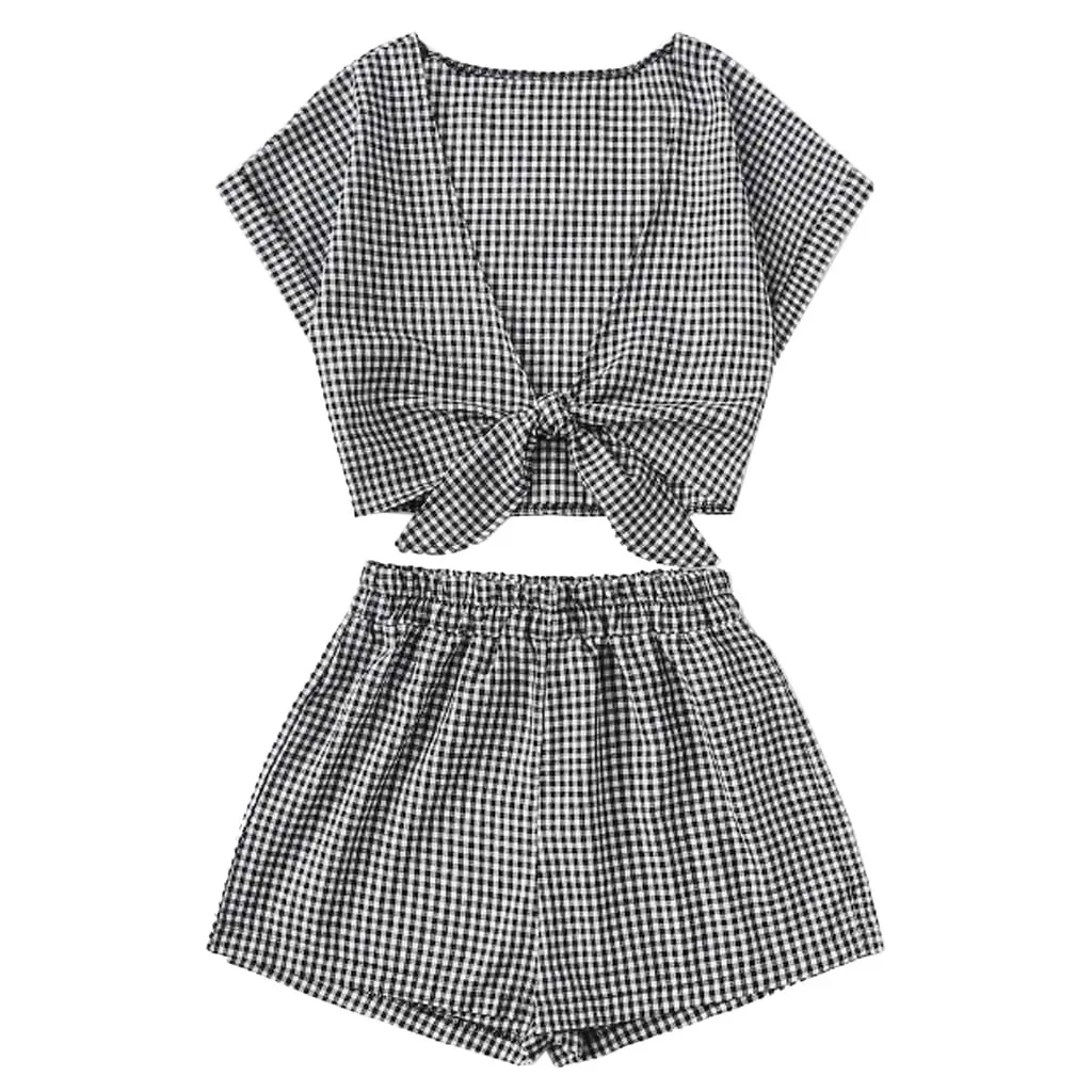 Special Offer ファッション女性チェック柄プリント半袖包帯 V ネックブラウス + ショーツホットパンツセットスーツ Conjuntos デ Mujer Discount 28% Today!