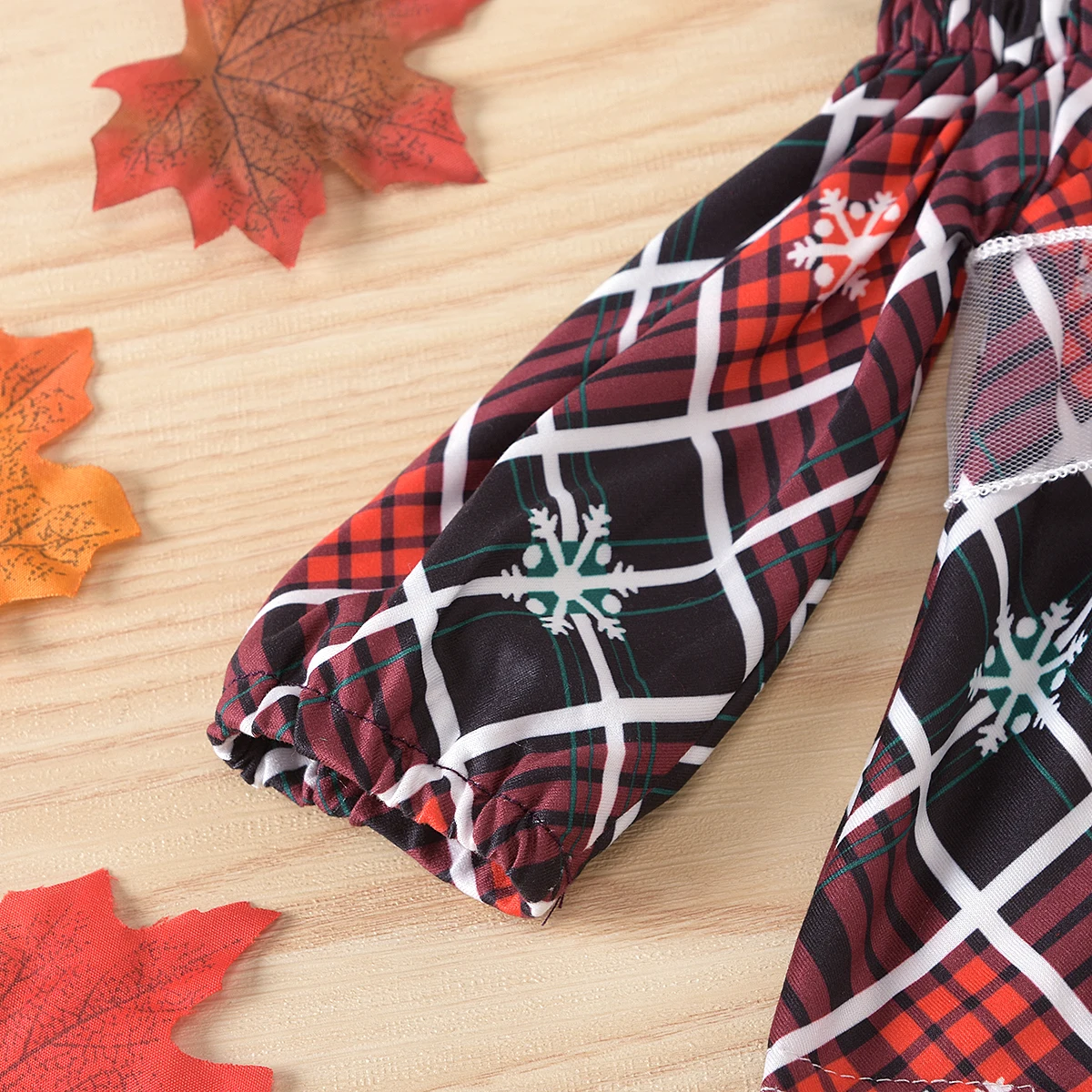 Product Name: 2020チェック柄子供レースビッグ弓オフショルダー長袖トップス + フレア長ズボンクリスマスパーティーキッズガールズ2個