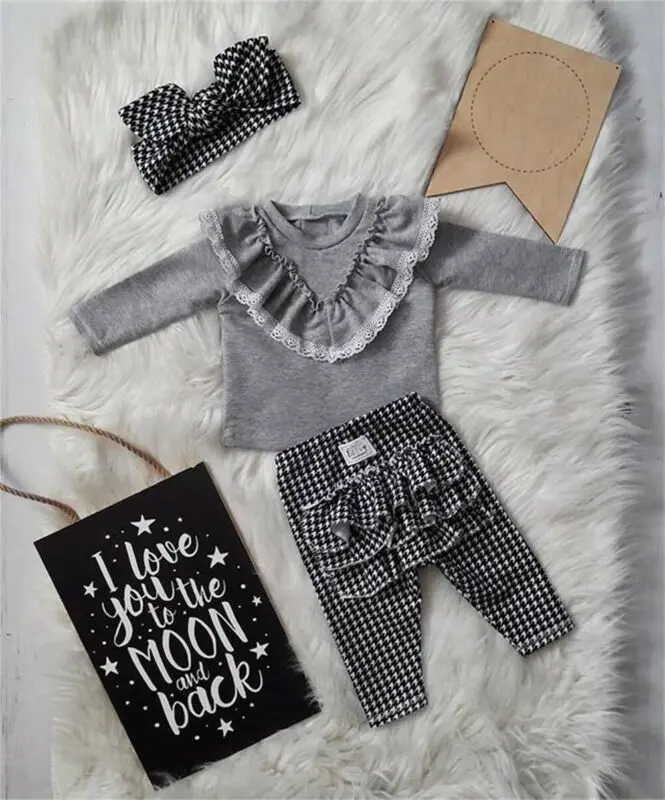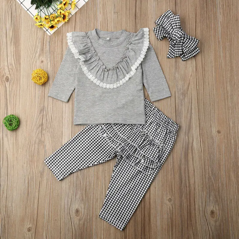 Special Offer 3 個幼児の子供の女秋服セット長袖レースフリルトップス + ロング格子縞のパンツ服 Discount 16% Today!